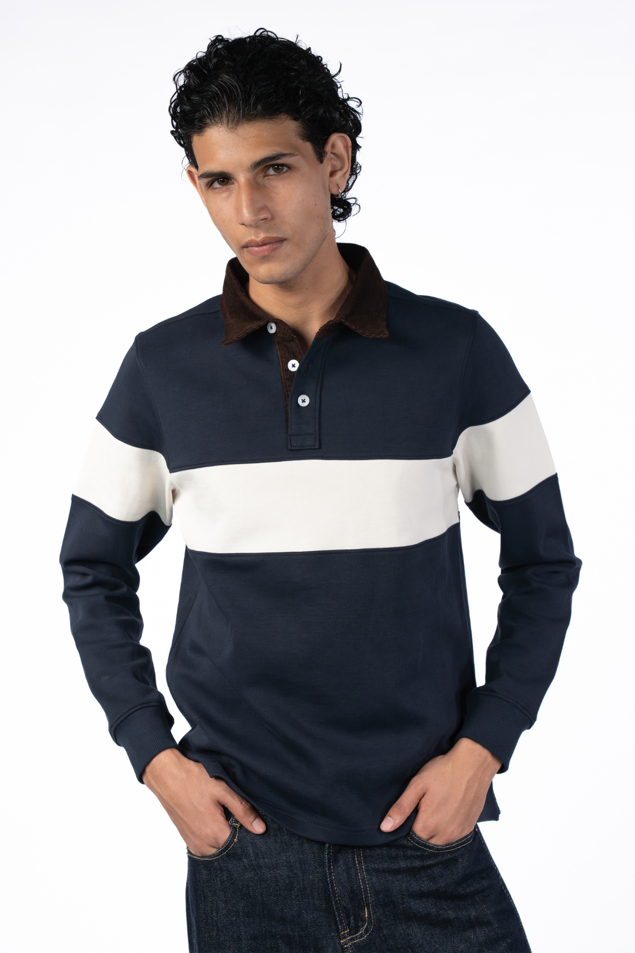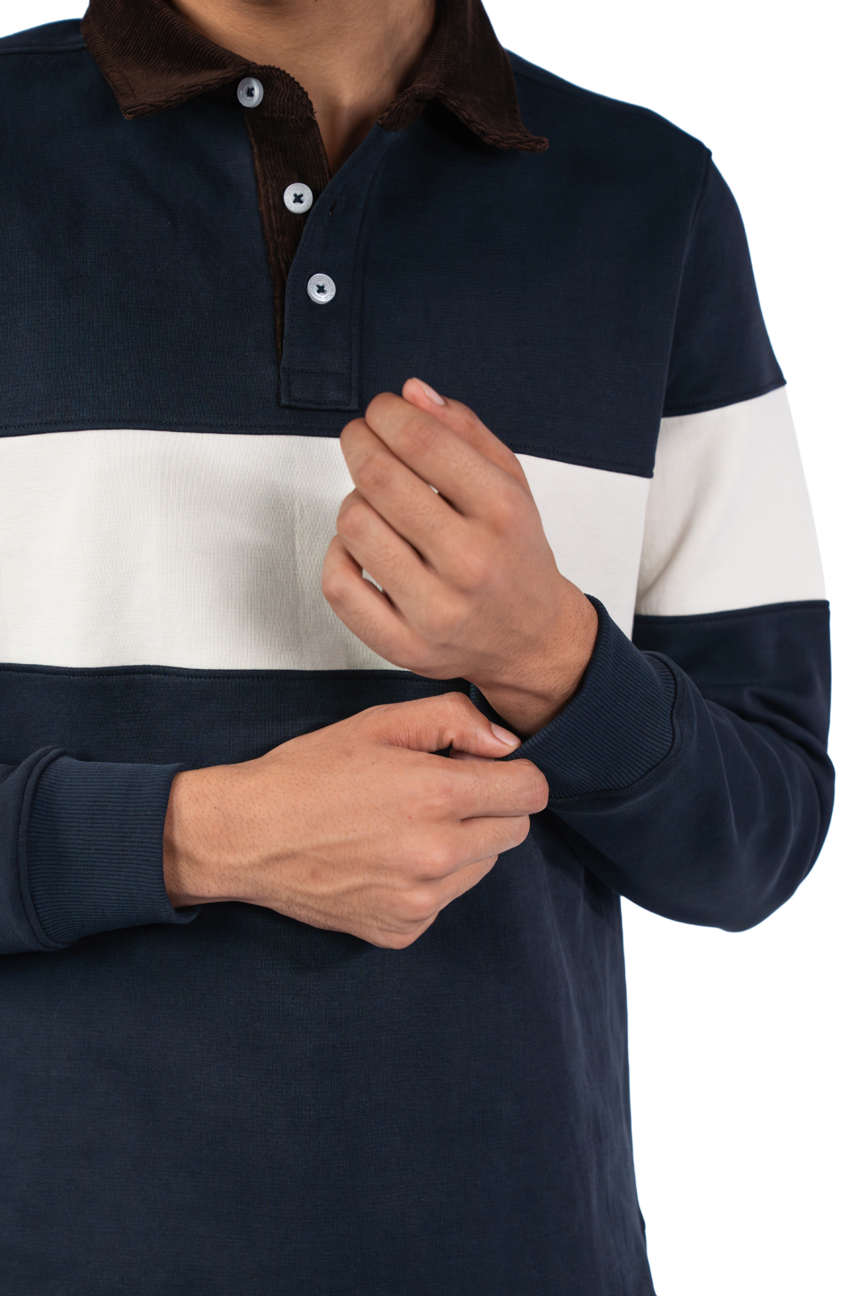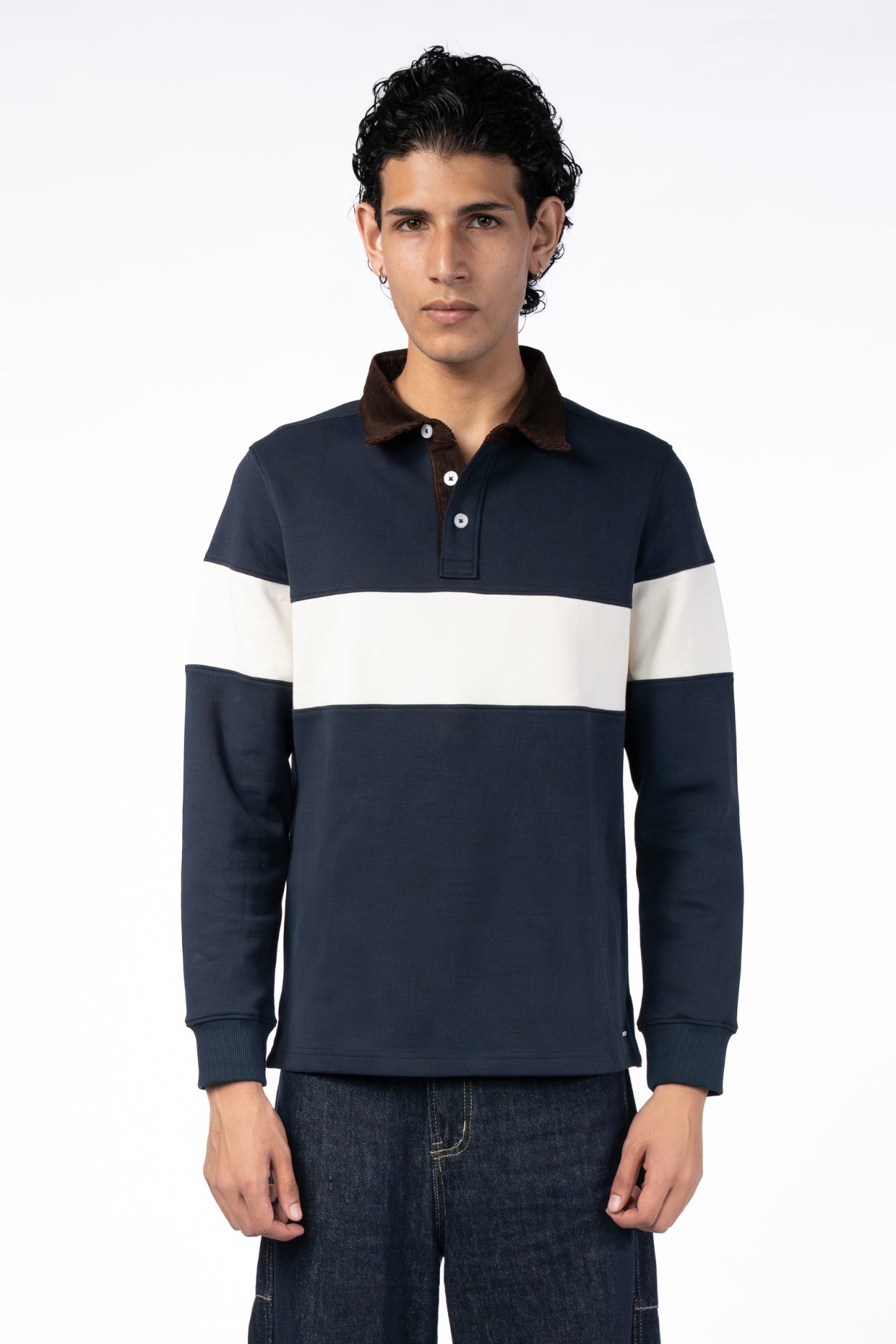 Upgrade your casual look with the Orlando Navy Corduroy Collar T-Shirt, blending comfort with a refined, panelled design.