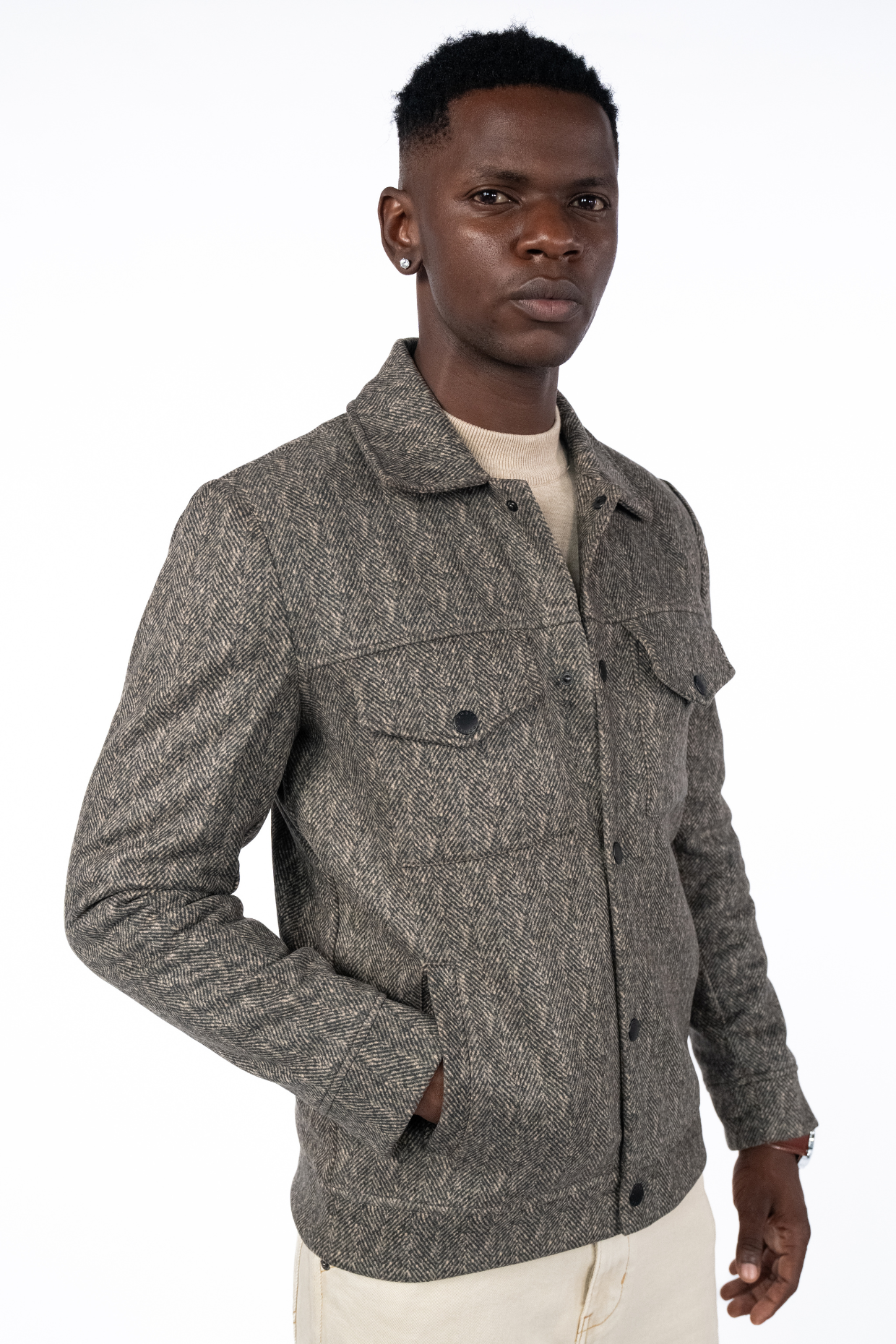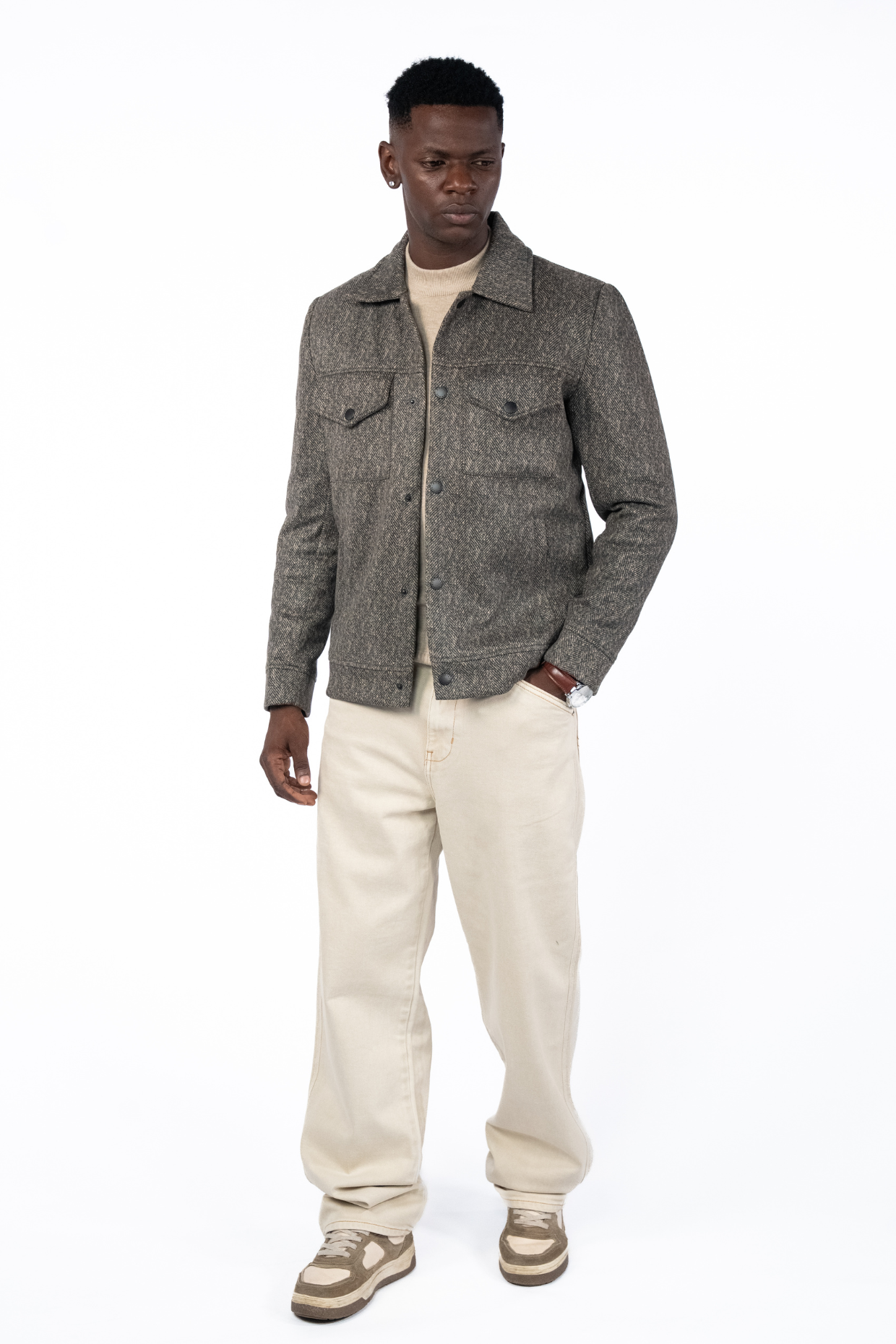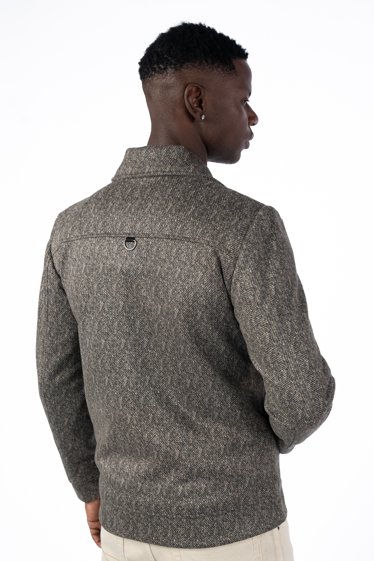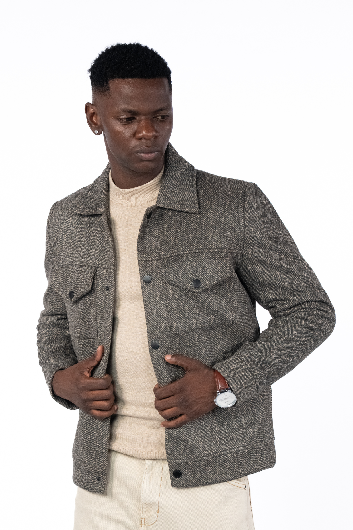 The Stafford Herringbone Jacket features a refined herringbone texture and collared design, blending smart style with modern ease for any occasion.